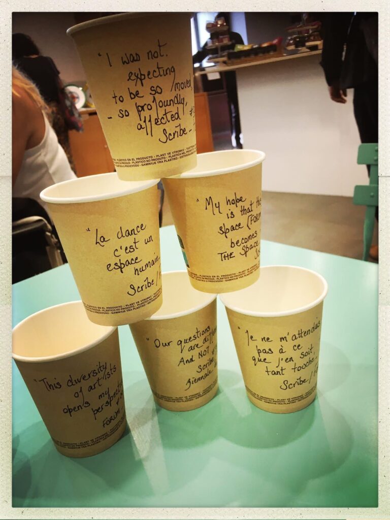 たとえば今回のFORUMでは、オーストラリアのレイサ・シェルトンの発案で、「SCRIBE」という取り組みが行われました。FORUMの様々なプログラムを体験した観客が、そのなかで感じたことや心に残ったことを言葉にし、それを「書き手(scribe)」役が書き留めていくというものです。そうして記録された体験は次第に蓄積され、「感情のアーカイブ(Archive of Affect)」を形作っていくことになりました。