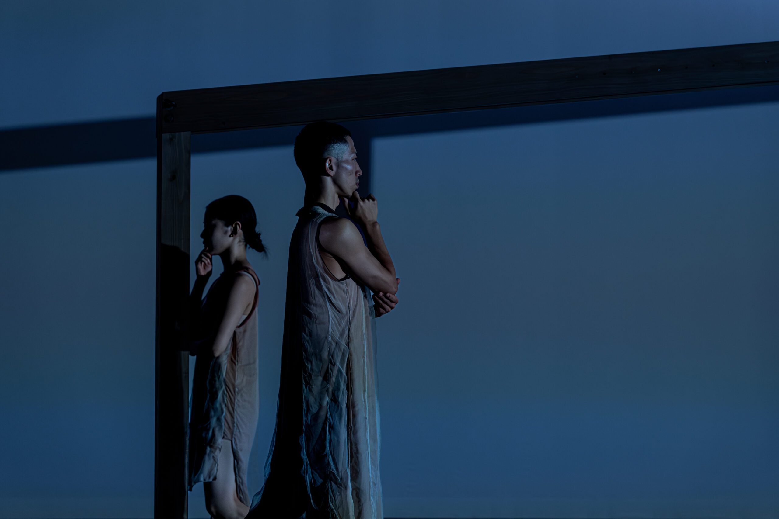 12月5日、本番当日。 赤レンガ倉庫の3階、会場をぐるりと迂回するように外廊下を歩き、会場に入ると、暗いステージの奥に白い壁と木製フレームのセットが鎮座していた。 まだ客電がついている中、ダンサーたちが静かに現れ、日本庭園の庭石のようにステージに座る。1人のダンサーがゆっくりと動き出し、柱に手を添える。見えない空気の流れに呼吸を合わせるように、ダンサーの身体の中に何かが流れ込んでいく。