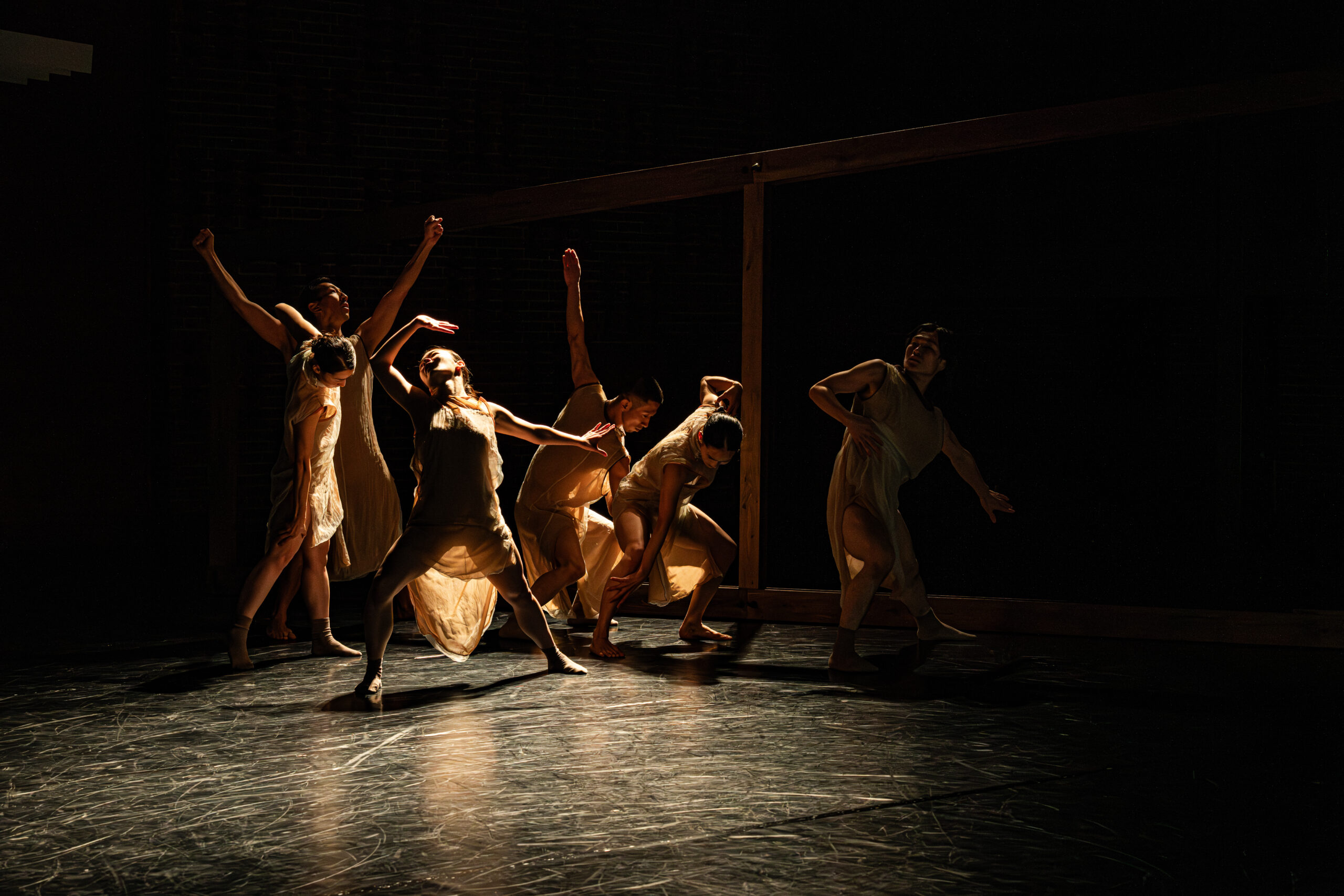 2025年11月14日、夕方。赤レンガ倉庫の3階にて稽古は行われていた。 扉を開けると、ざらりとした質感のアンビエントミュージックが耳を打つ。背後には木製の大きなフレームが組まれており、その前で4、5名のダンサーが踊っていた。