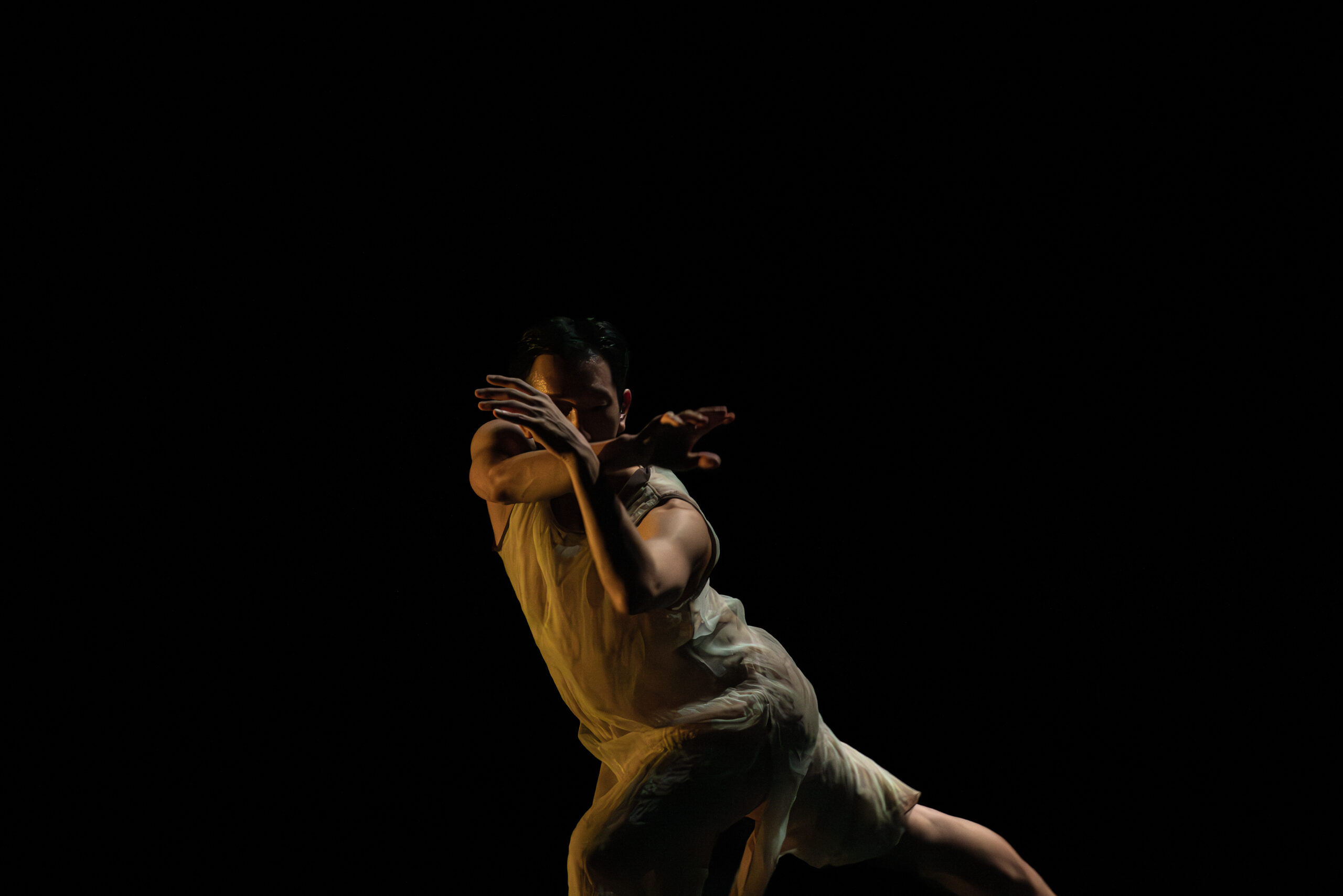 暗転。 ぼんやりと光る白い壁を背景に、ダンスはレリーフのように、平面的かつ立体的な陰影を帯びてうごめく。 1人のダンサーのソロが始まる。まるで時間のスピードが伸び縮みするような感覚を覚える。ガーゼのような衣装を纏ったダンサーたちは、男女という性差を超えた、プリミティブな存在のように見えた。